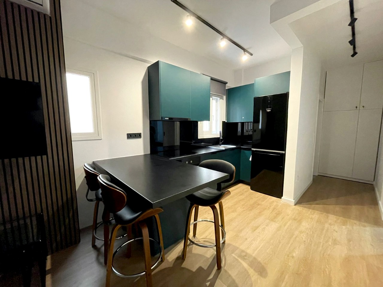 The open-plan kitchen features deep teal cabinetry, contrasted by sleek black countertops and appliances, offering a contemporary and luxurious feel. A central island extends into a casual dining space, accentuated by elegant wood and black barstools, seamlessly integrating style with practicality. The wood-textured flooring adds warmth to the space, balancing the modern black and teal palette with a touch of natural charm.