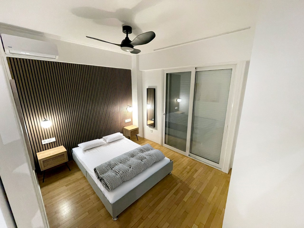 Subtle yet impactful design details, such as vertical wooden slats on the wall, ambient track lighting, and minimalist built-in storage, enhance the apartment’s spatial efficiency and aesthetic continuity. This renovation is a testament to YOMONOKIO’s expertise in creating contemporary interiors that are both functional and visually captivating.