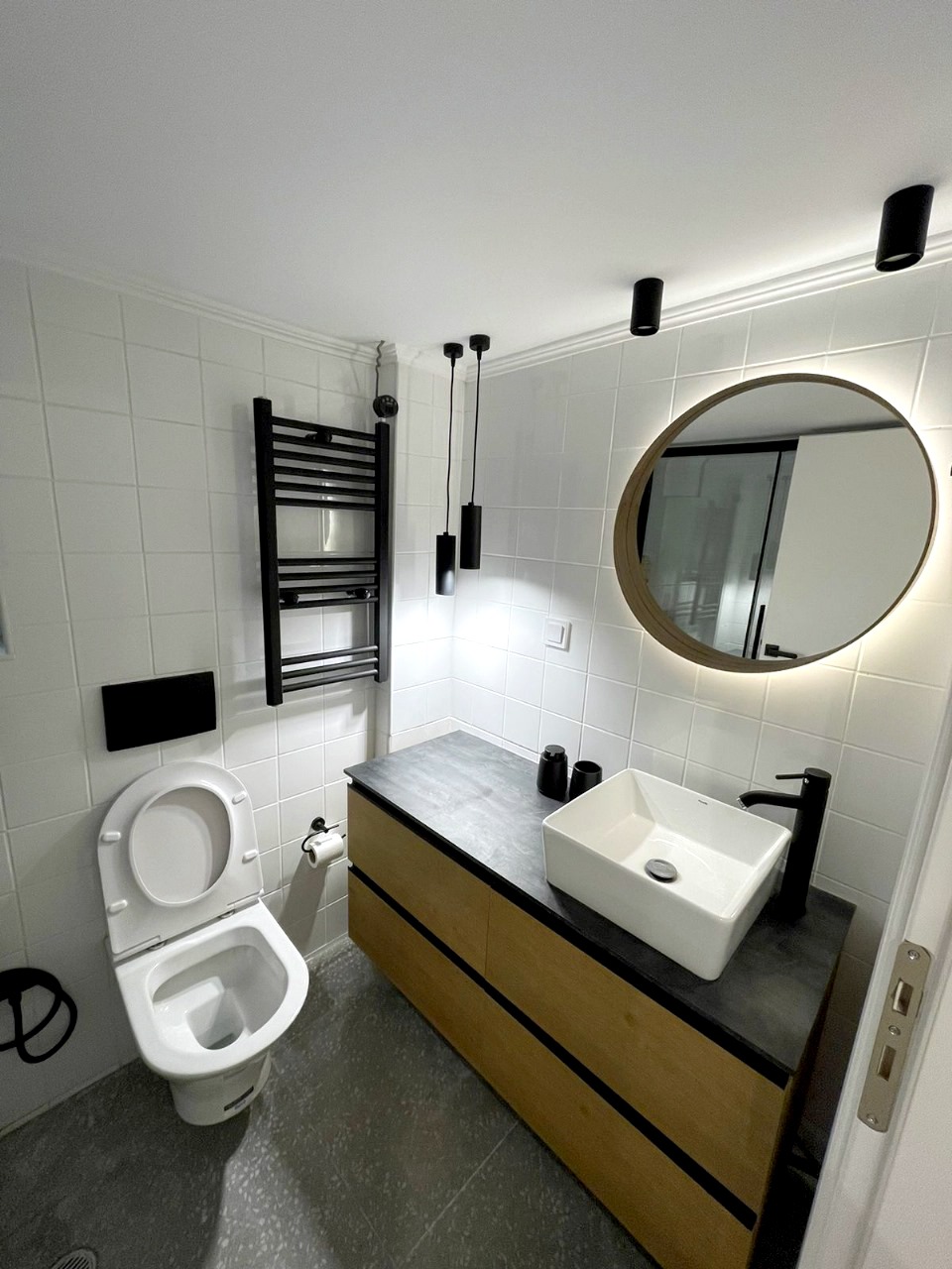 Subtle yet impactful design details, such as vertical wooden slats on the wall, ambient track lighting, and minimalist built-in storage, enhance the apartment’s spatial efficiency and aesthetic continuity. This renovation is a testament to YOMONOKIO’s expertise in creating contemporary interiors that are both functional and visually captivating.
